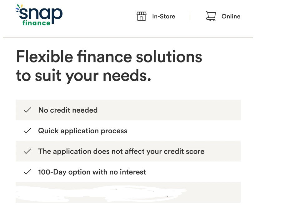 0$ Down Financing! Snap and Acima can help. We offers lease-to-own financing that empowers credit-challenged shoppers with the buying power to get what they need, now. Founded on the principle that you should thrive with financing that’s accessible, affordable, and completely transparent. The application is easy, and you’ll find out in seconds if you’ve been approved..