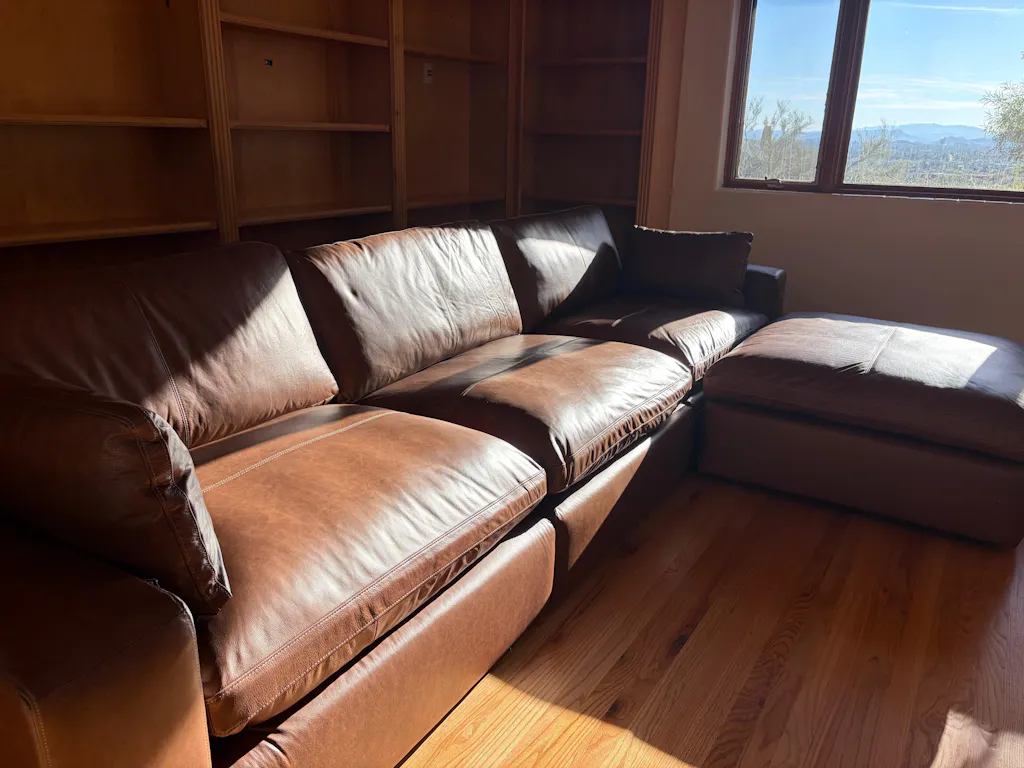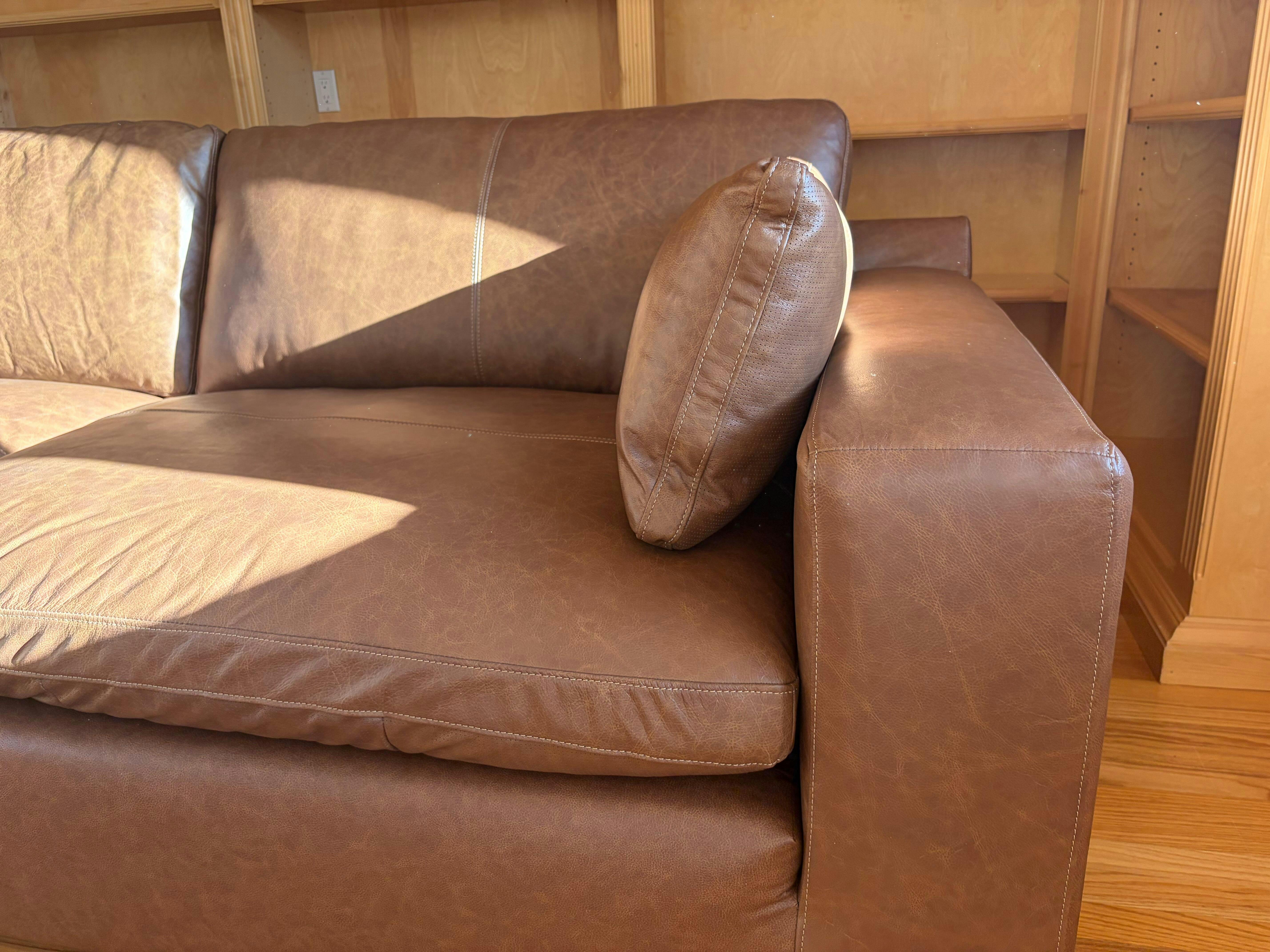 This sectional is crafted with a combination of genuine leather and skillfully matched faux leather. High-use areas like the back, seat, and arm cushions are upholstered in genuine leather, while faux leather covers the remaining surfaces for added affordability and durability. Natural variations in the leather, such as grain and shade differences, make each piece truly unique.