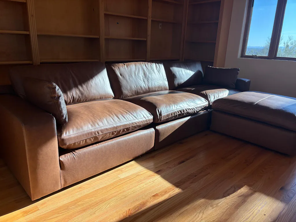 The Emilia Leather Cloud Sectional combines modern sophistication with versatile comfort, making it perfect for contemporary living spaces. Featuring feather-fiber blend cushions, arm bolster pillows, and a sleek, chunky silhouette, it balances bold structure with inviting softness. Fully finished on all sides, each modular piece can stand alone or be arranged effortlessly, offering endless possibilities for stylish, adaptable seating